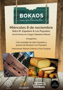 Dicho esto pasamos a comentar como transcurrieron estos Bokaos. El pasado martes 8, por la tarde, nos presentamos en el llagar de sidra M. Zapatero (si queréis conocer cómo es este llagar, lo podéis ver en la Colección de Corchos → Zapatero): es uno de los pocos llagares asturianos que sigue trabajando sólo con madera, tanto en toneles como en el llagar. Allí se pudieron degustar diferentes quesos de la Quesería Los Payuelos (León) acompañados de sidra dulce y algún culín de sidra espichado directamente del tonel.