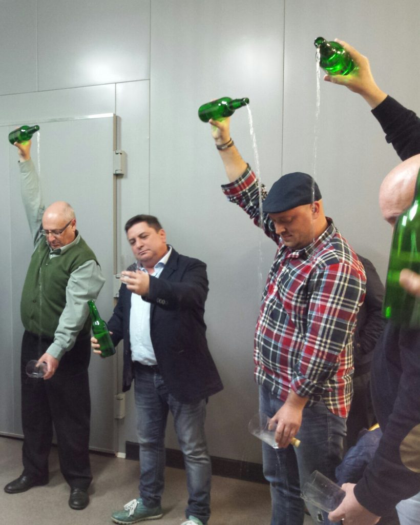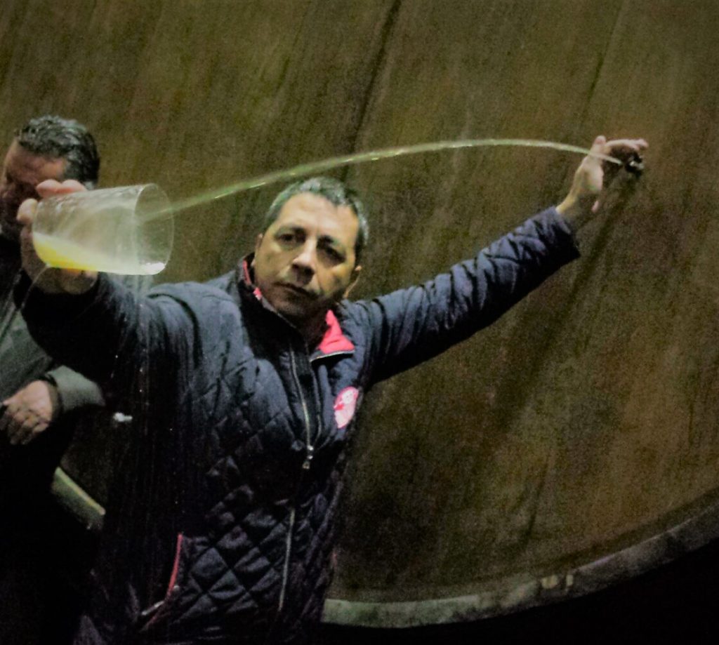 Cele Foncueva echando un culín mientras Mino Villarrica explica como saborearlo.