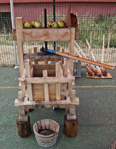 También tenían un apartado para los peques y no tan peques. Se puedo mayar manzanas a la antigua usanza. Ayudándose de pequeños mayos, los más peques aplastaban las manzanas sobre el duernu, de vez en cuando se recogía la tarea y se depositaba en un pequeño llagar ubicado al lado, donde continuaban con la labor, apretándolo, obteniendo sidra dulce.