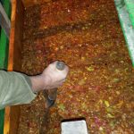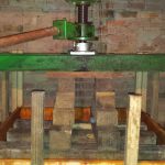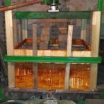El primer día después de mayar, con sólo apretarlo puede salir suficiente sidra. Pero los días posteriores hay que hacer algo para ayudar a salir la sidra, ya que la magaya está muy compacta, este paso se llamar «cortar» el llagar. ¿En qué consiste? se basa en quitar la magaya de los bordes colocándola en una zona más central, para reaprovecharla. Se descompacta, generando poros para facilitar apretarla de nuevo. ¿Cómo se realiza? Se hace un corte diagonal a 20 – 30 cm de las tablas del cajón, finalizando en la parte inferior más cercana al borde, con una pala con mango corto. Este tajo se realiza en la parte delantera y trasera de la magaya poniéndola a continuación en la zona mas central. Se puede apreciar en las siguientes fotos. ¿Cuántos cortes se hacen? Suele ser 1 o 2 por día, no más de 4 días consecutivos.