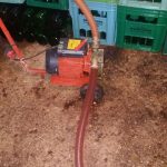 Una vez esté el duernu lleno (si recordamos es el recipiente redondo donde se deposita la sidra), se procede a rellenar los toneles. ¿Cómo se hace? Antiguamente se rellenaba con calderos o cubos cogiendo la sidra del duernu directamente, como se puede pensar este paso era largo y tedioso. Actualmente nos ayudamos de una pequeña bomba (llamada autoaspirante o de trasiego) y una manguera, absorbiendo la sidra para llevarla a los toneles.