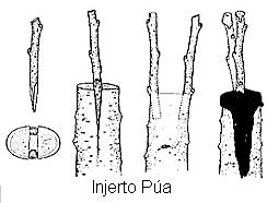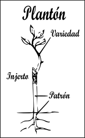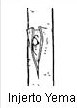 Es la parte de unión entre la variedad y el patrón. Puede ser por una yema (injerto de yema) o un brote (injerto de púa). Consiste en la fusión de una planta con una determinada variedad, al introducirla en otra (patrón). El injerto nunca se puede tapar, debe estar al aire libre. A continuación se muestran algunos ejemplos de injerto de yema o de púa.