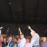 El primer culín fue echado por los ganadores del año pasado, Jose Luis Vigón (sidra Orizón – Elogio de Oro 2017) y Andrés Canal (sidra Canal – Premio Popular 2017) y este fue para el tonel de oro de este año, Rosabel Berrocal y la alcaldesa Carmen Moriyón.
